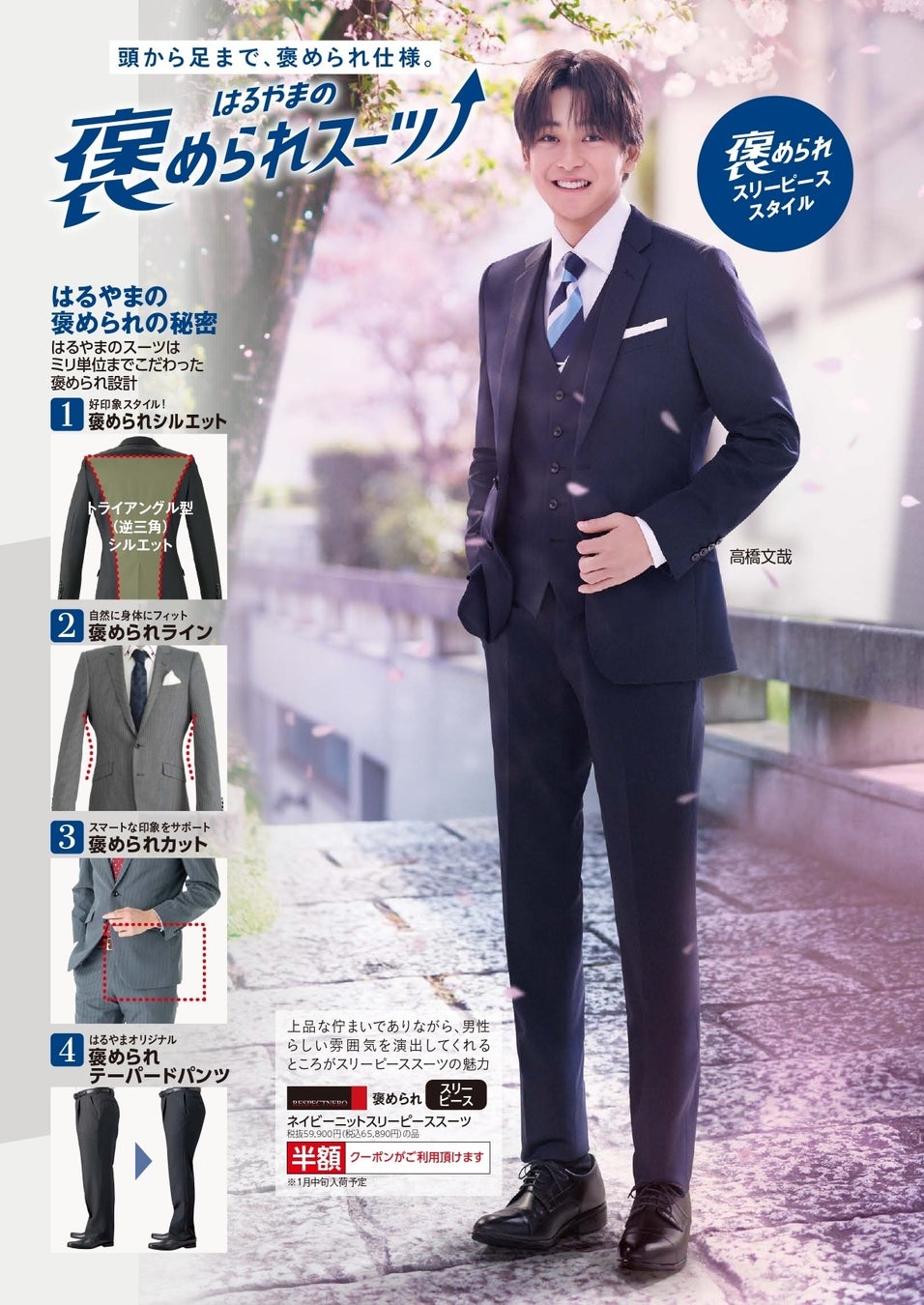 「褒められスーツ」は、新大学入学生や新社会人など、この春に新生活を迎えるフレッシャーズを応援するために、脚長・美脚見えデザインやスーツ専門店ならではの仕立てなど、「褒められポイント」を頭から足まで詰め込んだ、はるやまならではのスーツです。