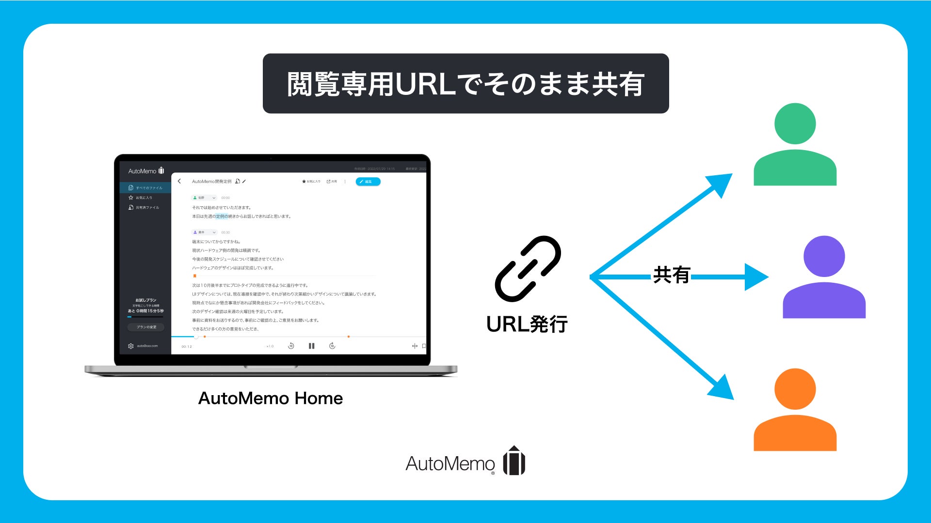 URLを共有された人であれば誰でも閲覧可能で、オートメモを使っていない方にも簡単に共有し、確認いただけます。