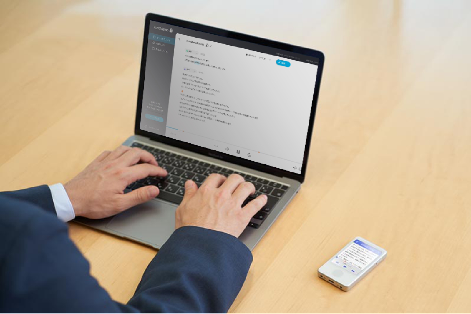 本webアプリでは、オートメモ製品(オートメモ、オートメモ S、オートメモ App)で録音した音声の文字起こし結果の確認や編集、共有ができます。また音声で話者を自動で識別し、議事録の作成にかかる手間をさらに短縮します(文字起こしにはプランに応じて料金が発生します)。