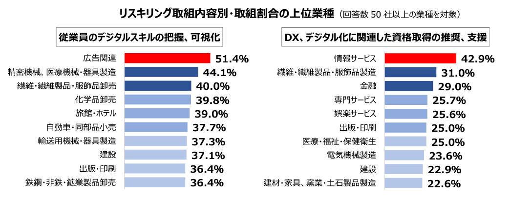 リスキリングの取組内容ごとに取組割合上位の業種をみると顕著な特徴がみられた。「従業員のデジタルスキルの把握、可視化」の取組内容では「広告関連」が51.4%と全業種で最も高く、2位の「精密機械、医療機械・器具製造」44.1%と大きな開きがあった。