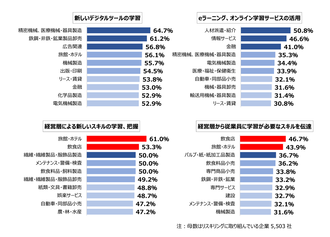 また、経営層が自ら学び実践する姿勢を示す「経営層による新しいスキルの学習、把握」や、従業員が新しい仕事に就く際に何を学べば良いかを示す「経営層から従業員に学習が必要なスキルを伝達」では、いずれも「旅館・ホテル」、「飲食店」が上位に並び、他の取組内容との違いが際立った。
