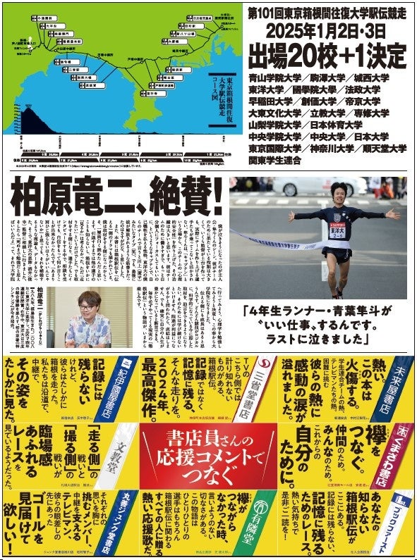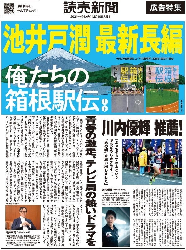 これは今回特別に「読売新聞広告特集」として数量限定で作成したもので、表・裏2面からなるカラー刷り新聞です。池井戸さんのインタビュー記事のほか、かつて箱根路を走った川内優輝、柏原竜二の両選手からのメッセージ、来年1月2・3日に開催される第101回東京箱根間往復大学駅伝競走のコース図や出場校も分かる内容になっています。