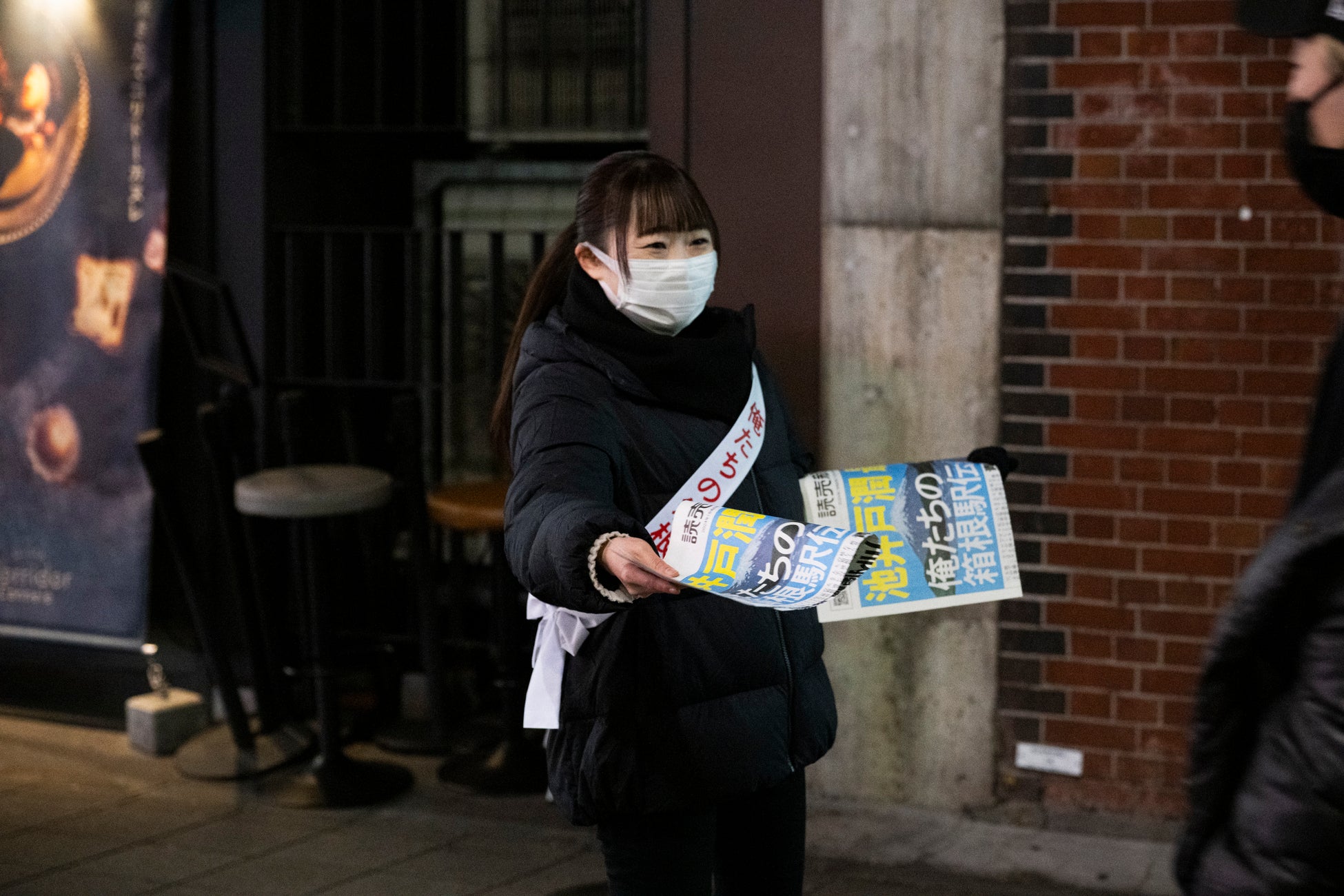 タイトル名をプリントした襷をつけた配布要員から、道行く多くの方々が興味深そうに手に取ってくださいました。