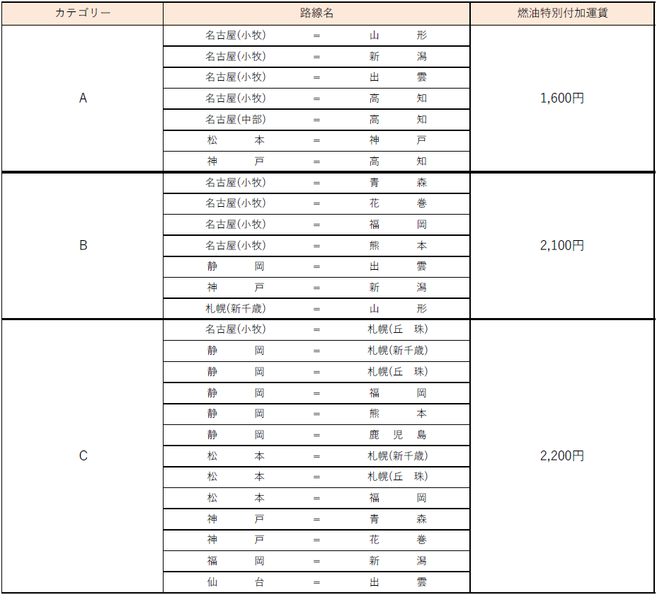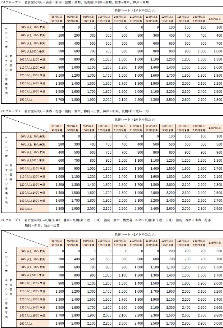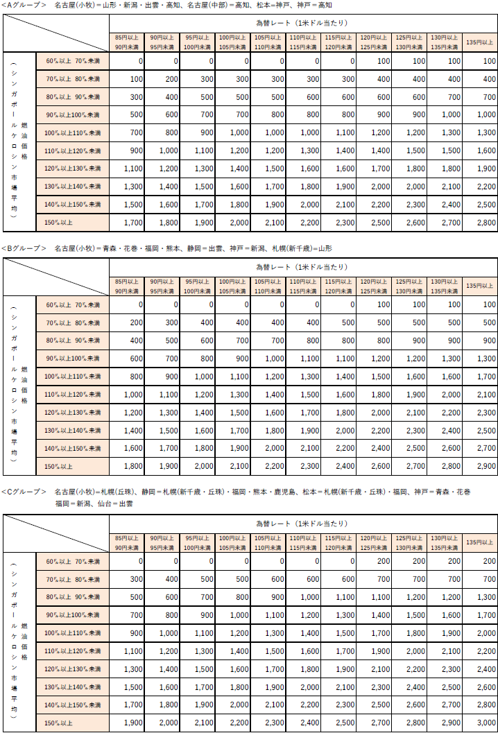 なお、燃油特別付加運賃は、シンガポールケロシン市況価格および為替レートの変動に応じて、1ヶ月毎に見直しております。