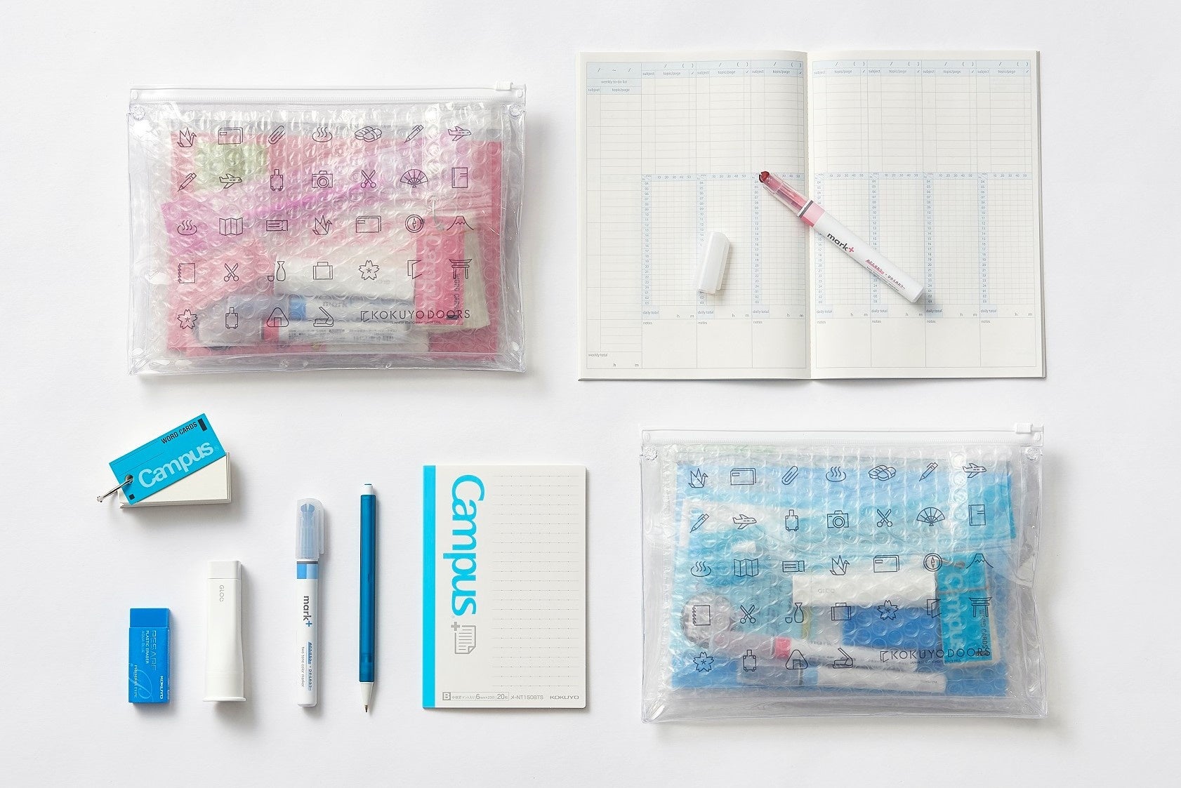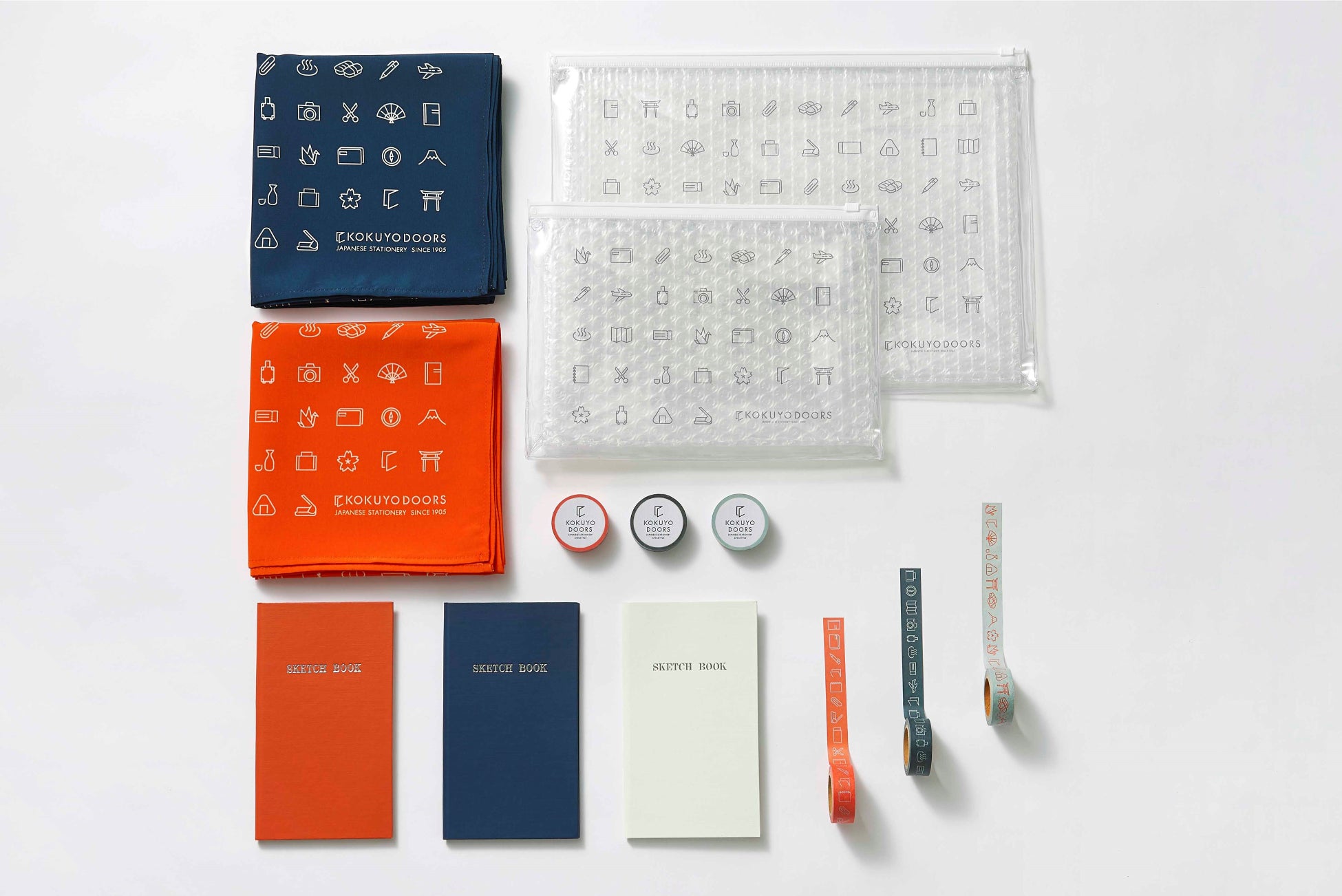 「KOKUYODOORS」のロゴや、旅、文具をモチーフにしたアイコンをあしらった、限定アイテム。