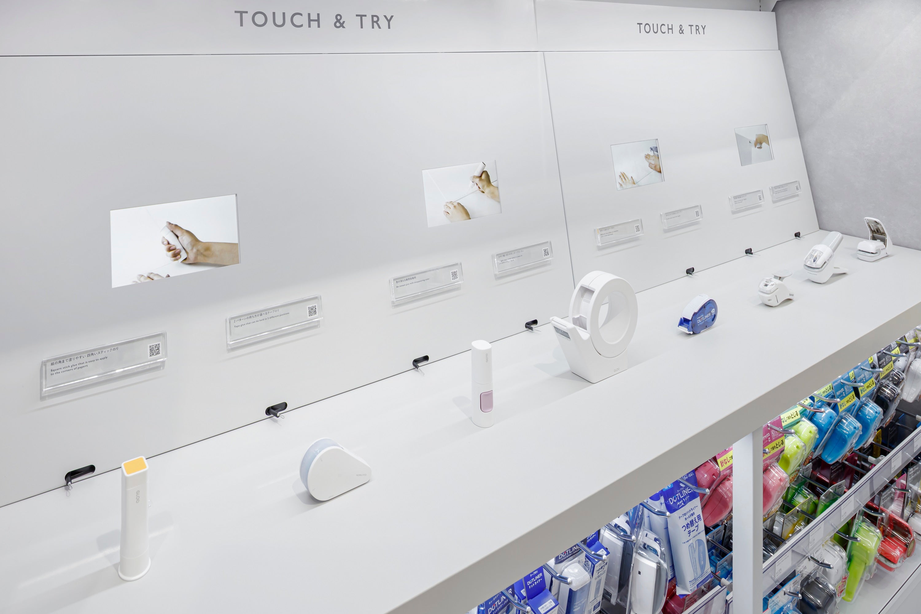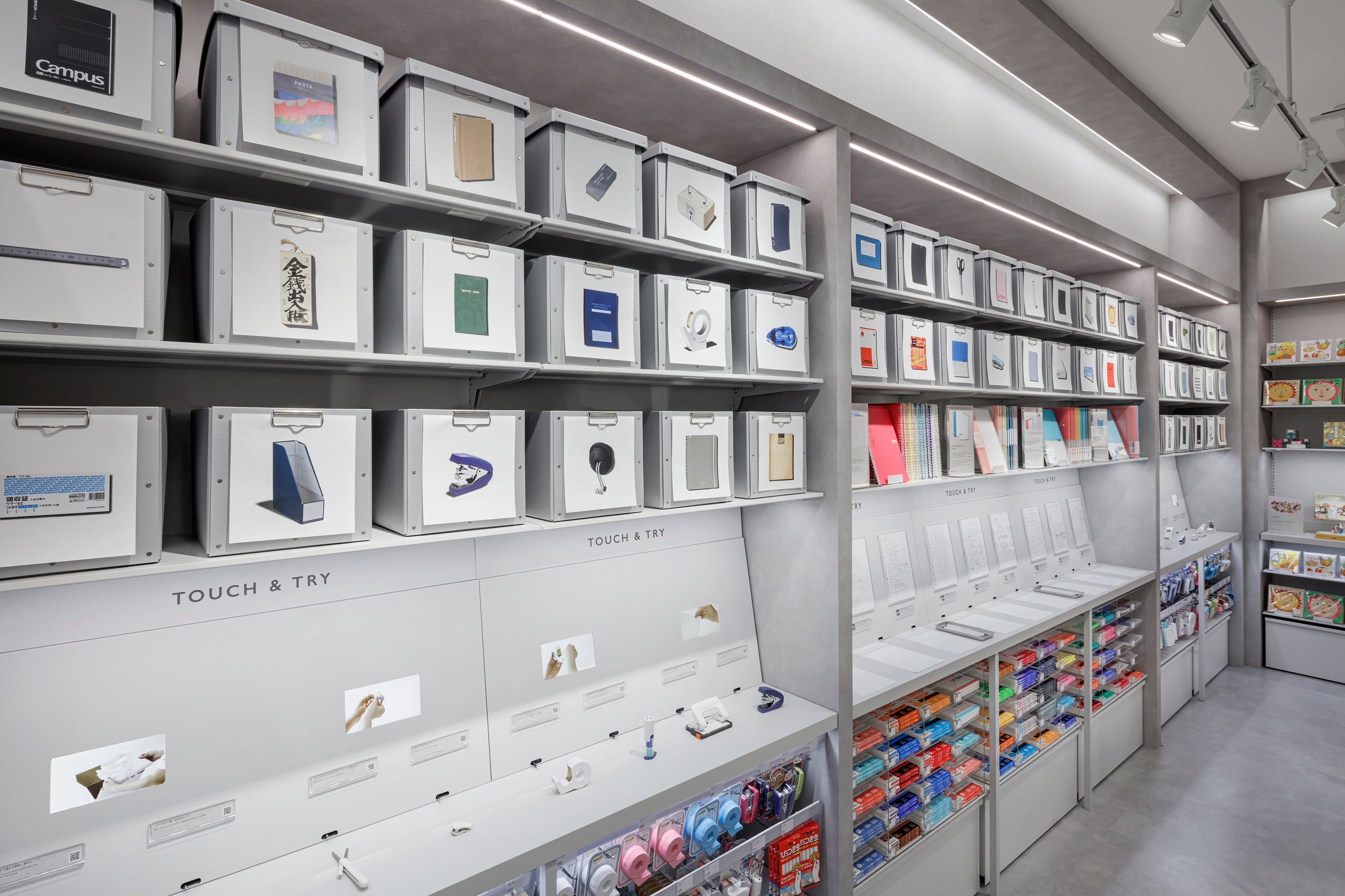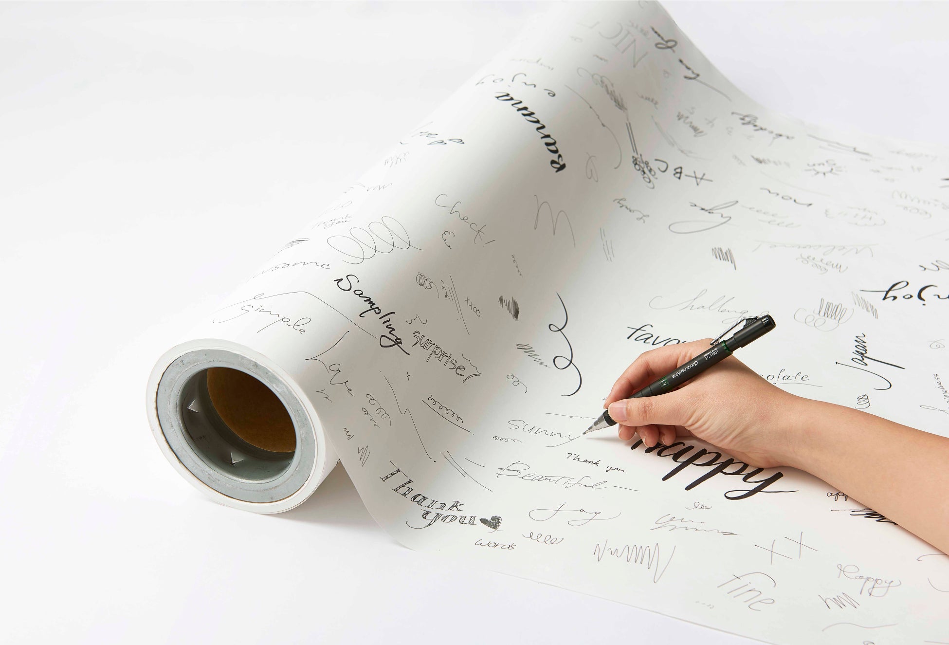 機能性、品質に優れた文具の使い心地を自由に試せるタッチアンドトライコーナー。工場から直送された原紙ロールに、さまざまな筆記具でダイナミックに試し書きをすることも可能です。