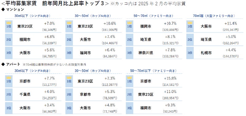 <2025年2月 全国主要都市における賃貸マンション・アパートの平均家賃(面積帯別)>