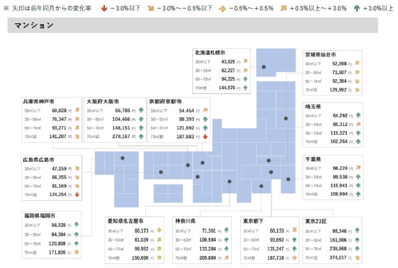●マンションは、カップル向きが広島市を除く12エリアで前年同月を上回る。中でも、首都圏5エリア(東京23区・東京都下・神奈川県・埼玉県・千葉県)および札幌市・名古屋市・京都市・大阪市・福岡市の10エリアで2015年1月以降最高値を更新。東京23区の最高値更新は27カ月連続に。