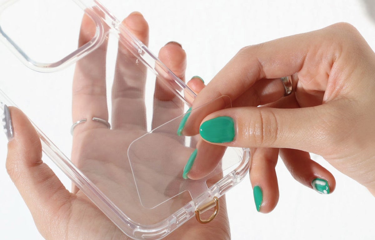 お好みのスマホケースにクリアシートを挟むだけで簡単にショルダーストラップが装着可能です。