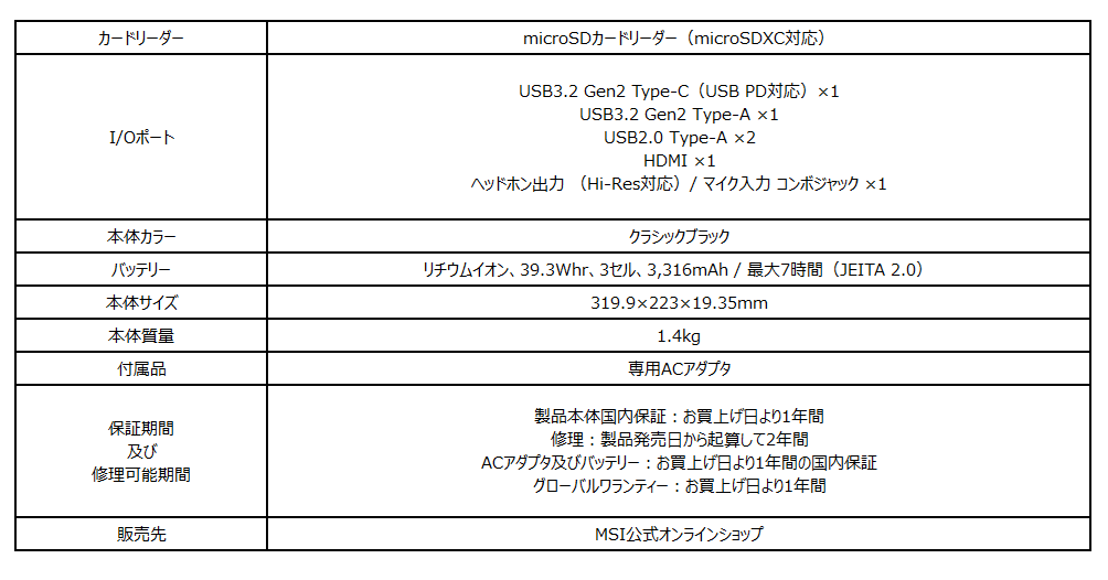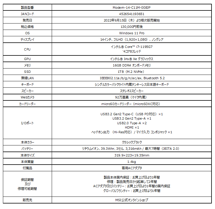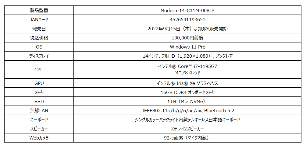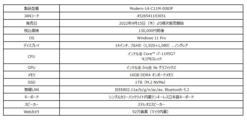また、薄さ19.35mm・軽さ1.4kgで楽々持ち運べるビジネスノートPC「Modern-14-C11M-008JP」を2022年9月15日(木)より発売いたします。