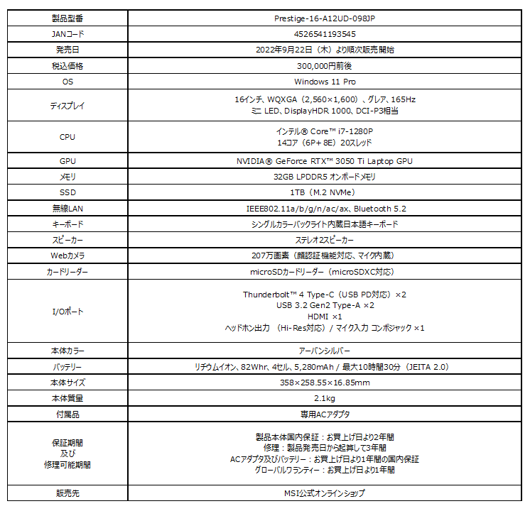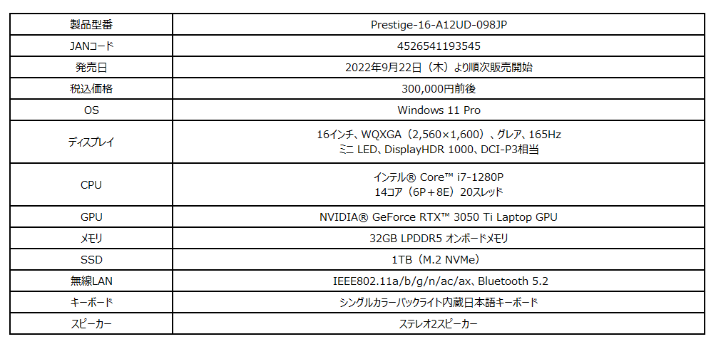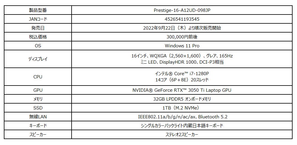 クリエイティブ用途とハイブリッドワークを効率化するビジネス・クリエイターノートPC「Prestige-16-A12UD-098JP」 MSIストア限定にて2022年9月22日(木)より販売開始
