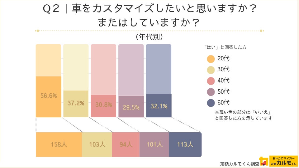そこで「はい」と回答した方を年代別で見てみると、最も多いのは20代で158人でした。同年代で車を持っている、または将来的に欲しいと思っている方の中でも56.6%を占めています。ここから、20代は車のカスタマイズへの興味関心が高いことがわかります。一方、「はい」と回答した方が最も少なかったのは40代で94人。同年代の中で占める割合も30.8%にとどまっています。