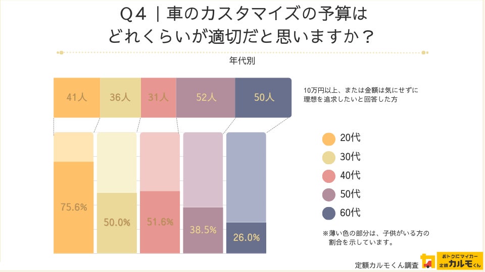 Q2の回答と合わせると、教育費などがかかる年代では車のカスタマイズにかけられる予算が低くなりがちで、それに伴い意欲も抑えられる傾向があるといえそうです。