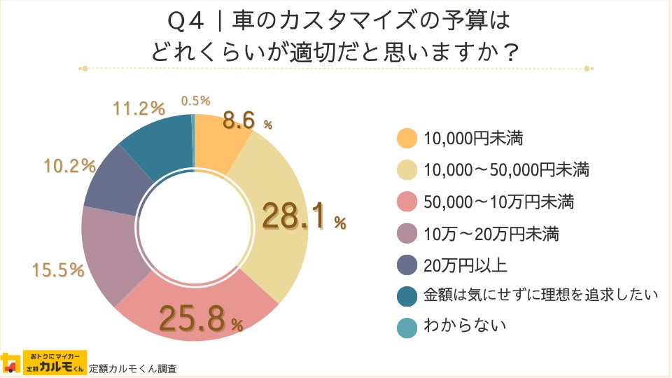 Q2で車をカスタマイズしてみたい、またはしていると回答した方に、車のカスタマイズにかける適切な予算についてもお聞きしました。その結果、「10,000~50,000円未満」が28.1%、「50,000~10万円未満」が25.8%と、半数以上の方が数万円程度の金額が望ましいと回答しました。
