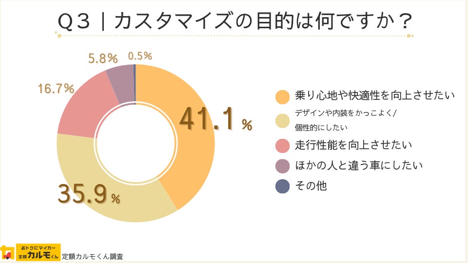 続いて、Q2で車をカスタマイズしてみたい、またはしていると回答した方にカスタマイズのおもな目的を聞いたところ、「乗り心地や快適性を向上させたい」の41.1%と、「デザインや内装をかっこよく/個性的にしたい」の35.9%で8割近くを占める結果となりました。