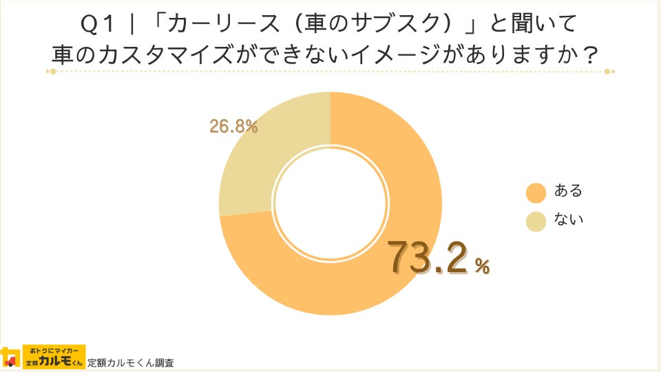 車を持っている、または将来的に欲しいと思っている方に、カーリースにおけるカスタマイズのイメージを聞いたところ、カスタマイズできないイメージが「ある」と回答した方は73.2%、「ない」と回答した方は26.8%で、7割以上の方がカーリースはカスタマイズができない認識であることがわかりました。