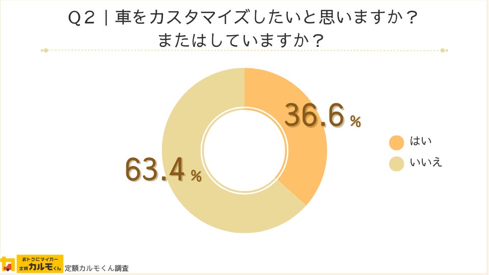 車をカスタマイズしたい、またはしているか聞いたところ、「はい」は36.6%、「いいえ」は63.4%という結果となりました。「はい」と回答した方では「キャンプ仕様にした」などカスタマイズで趣味を充実させている様子がうかがえる一方、「いいえ」と回答した方からは「若くないし、カスタマイズでイケイケより、純正状態を雰囲気良く楽しみたい」との声も寄せられました。