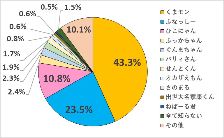 「ゆるキャラと言えばどのキャラクターですか?」という質問で圧倒的1番だったのは、第1回「ゆるキャラグランプリ」で優勝した、熊本県のマスコットキャラクターの「くまモン」で43.3%。2番目は、ハイテンションで激しい動きが目を引く、千葉県船橋市のマスコットキャラクター「ふなっしー」で23.5%。3番目は、ゆるキャラブームの火付け役である、滋賀県彦根市のマスコットキャラクター「ひこにゃん」で10.8%という結果になりました。