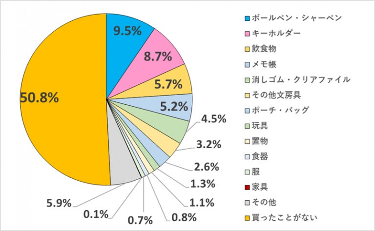 「どのような、ゆるキャラ・ご当地キャラのグッズを買ったことがありますか?」という質問では半数以上の人が「買ったことがない」と回答した。買ったことがある人の中では、「ボールペン・シャーペン」が人気で9.5%、次いで「キーホルダー」が8.7%となりました。