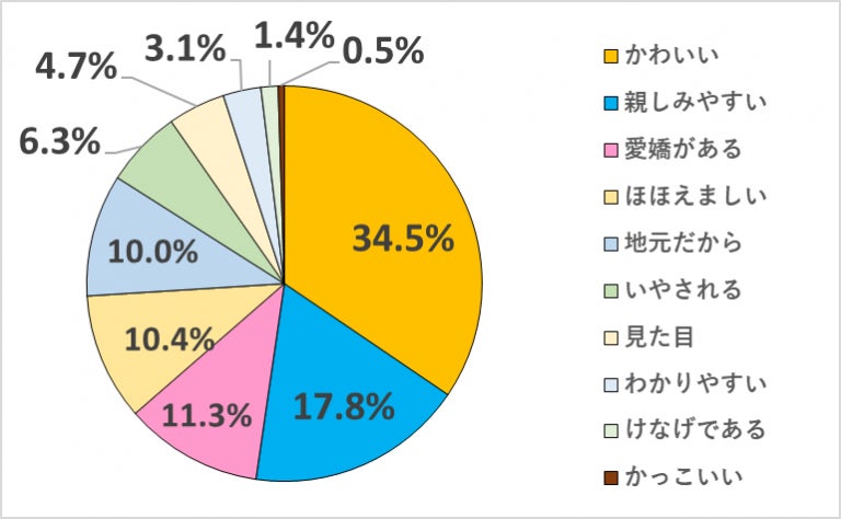 「ゆるキャラ・ご当地キャラを好きな、1番の理由はなんですか?」という質問で1番多かったのは「かわいい」で34.5%でした。次いで、「親しみやすい」が17.8%、「愛嬌がある」が11.3%でした。ゆるキャラは「ゆるいマスコットキャラクター」の略なので、「かっこよさ」という理由で好きな人は、0.5%と少数派でした。
