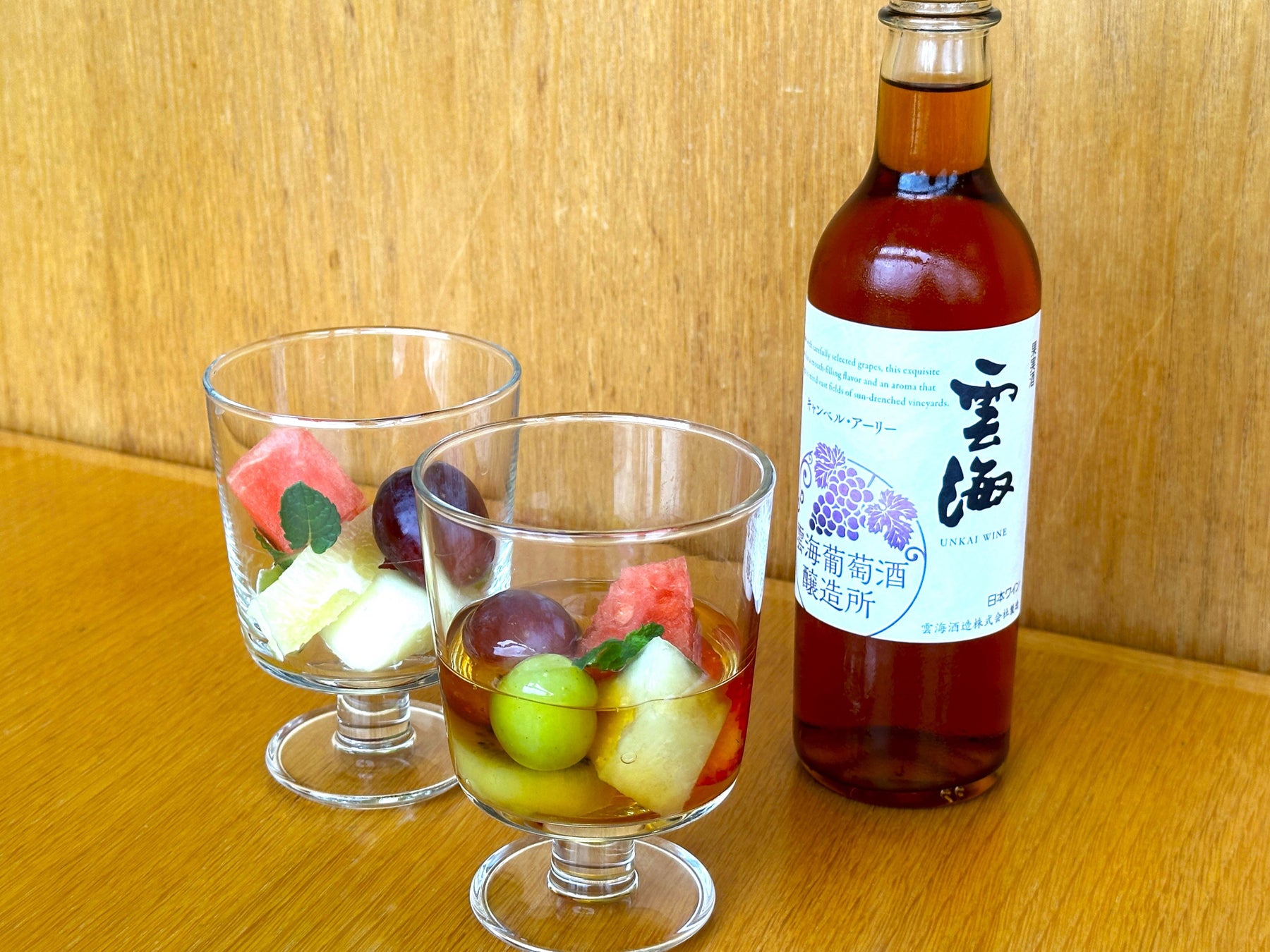 ビュッフェでご用意しているフルーツカップに、「雲海ワインキャンベル・アーリー」を注いでお召し上がりください。また、フルーツカップに入ったフルーツ以外にも、ビュッフェに並んでいるシーズンフルーツを追加して、自分好みのオリジナルフルーツサングリアを作るのもおすすめです。