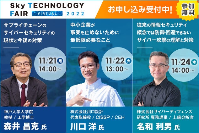 Sky株式会社では、現在開催中のオンラインイベント「Sky Technology Fair Virtual 2022」にて、スペシャルウィーク企画「情報セキュリティ ~急増するサイバー攻撃の脅威と次世代セキュリティ」として専門家による各種講演を11月21日より順次ライブ配信いたします。