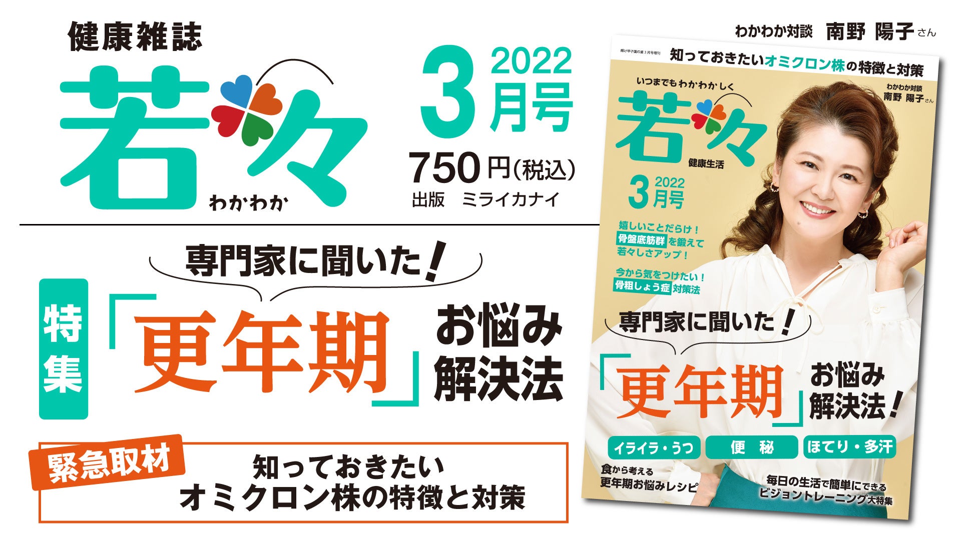 株式会社わかさ生活(本社:京都市下京区)は、健康雑誌『若々(わかわか)』2022年3月号を2022年3月1日(火)に株式会社ミライカナイ(本社:東京都中央区)から発売いたします。