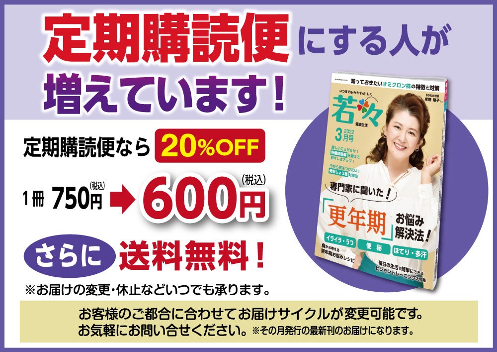 『若々』3月号では、「更年期の心とカラダをケア」をテーマに、生活に役立つ情報をお届け。皆さまが「若々しく健康的な生活」を実現するためのお手伝いをいたします。