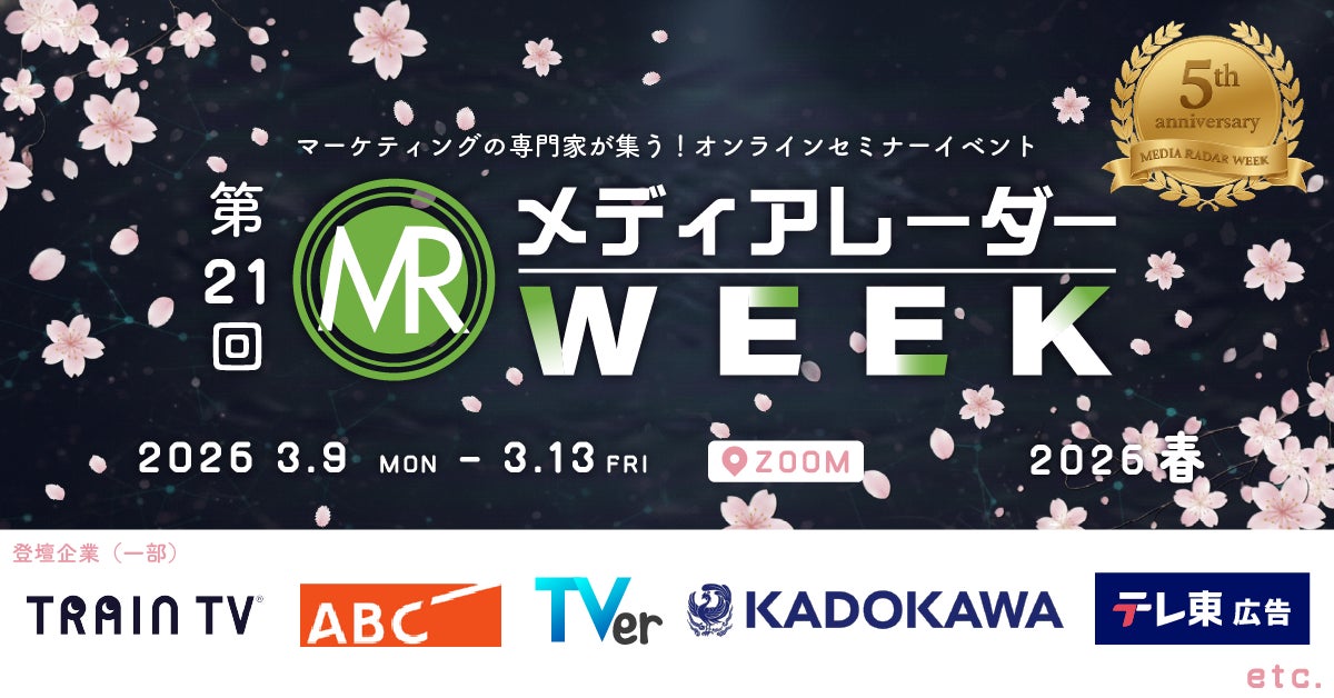 株式会社アイズ(所在地:東京都渋谷区、代表取締役社長:福島範幸、東証グロース:5242)が運営するNo.1*の広告業界のプラットフォーム「メディアレーダー」は、2026年3月9日(月)~3月13日(金)の5日間で、マーケティングセミナーイベント「第21回メディアレーダーWEEK 2026 春」を開催します。