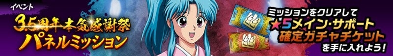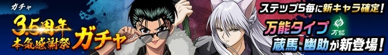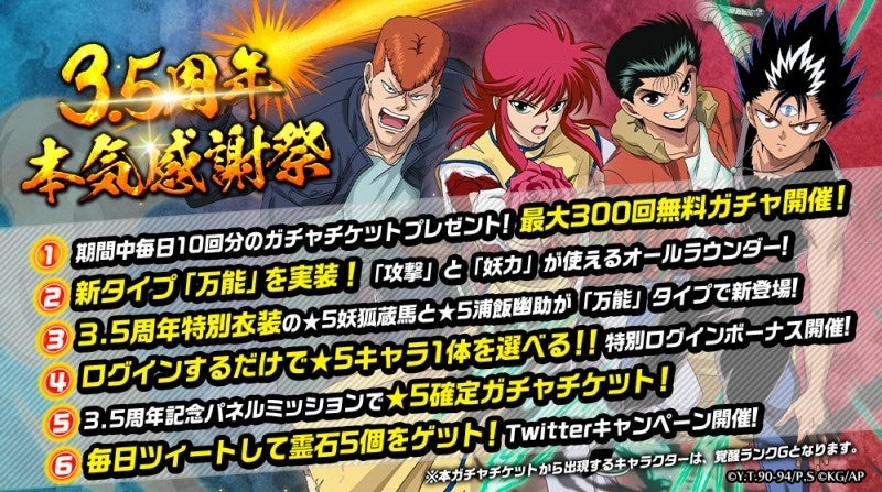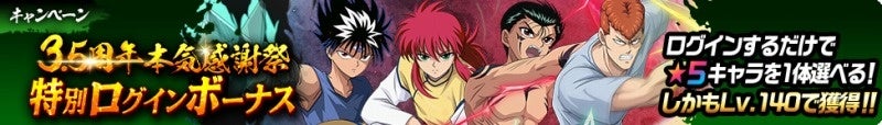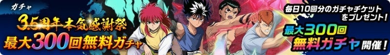 リリース3.5周年を記念して「最大300回無料ガチャ」が引けるキャンペーンのほか、選んだ★5キャラクターをLv.140で獲得できる特別ログインボーナスなど、「幽☆遊☆白書 100%本気(マジ)バトル」をますますお楽しみいただけるさまざまなキャンペーンを開催いたします。