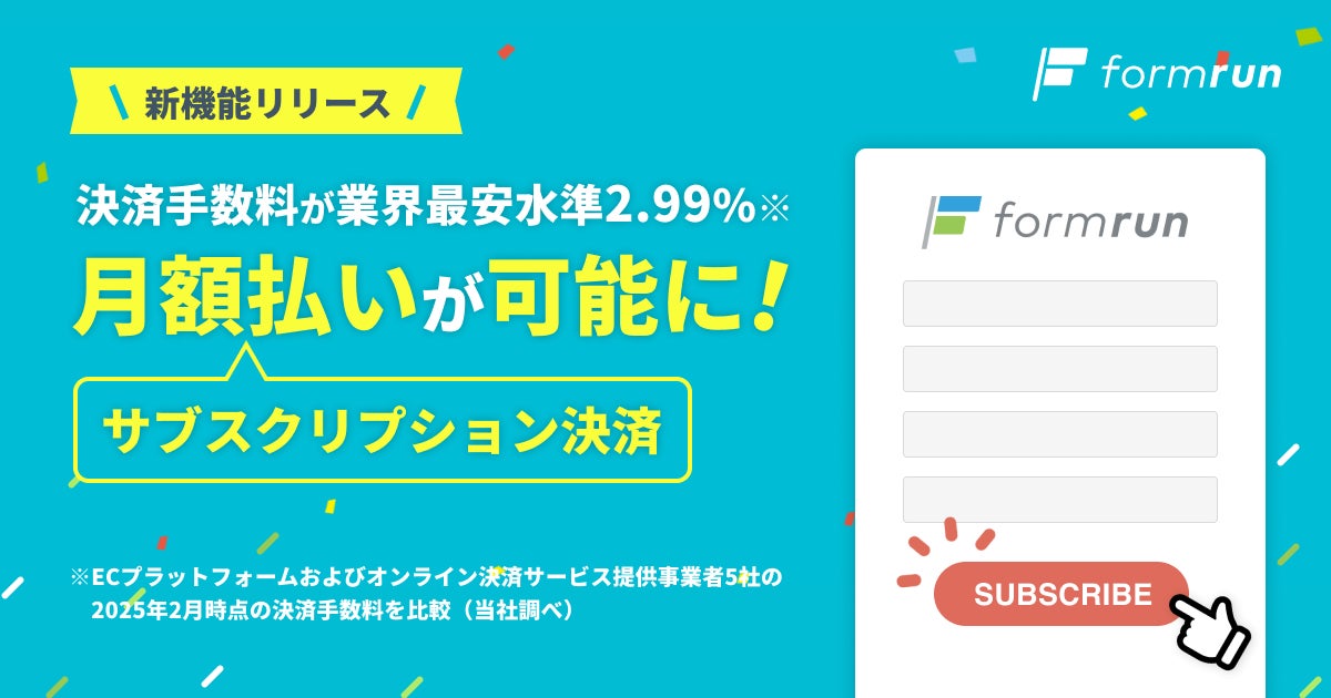 株式会社ベーシック(本社:東京都千代田区、代表取締役:秋山勝、以下「当社」)は、累計40万ユーザーが利用するフォーム作成管理ツール『formrun(フォームラン)』において、2025年2月12日(水)より新たに月額払いのサブスクリプション型決済機能を追加いたします。