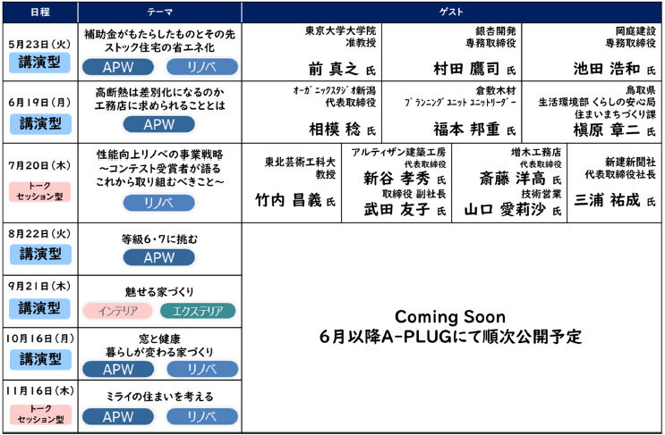 YKK AP主催のオンライン配信5回、外部イベント連動型での配信2回の合計7回開催し、プロユーザーの方にお役立ていただける家づくりのヒントを提供します。初回のオンライン配信では特別ゲストも登場し、生活者視点の家づくりの疑問を専門家へ切り込みます。