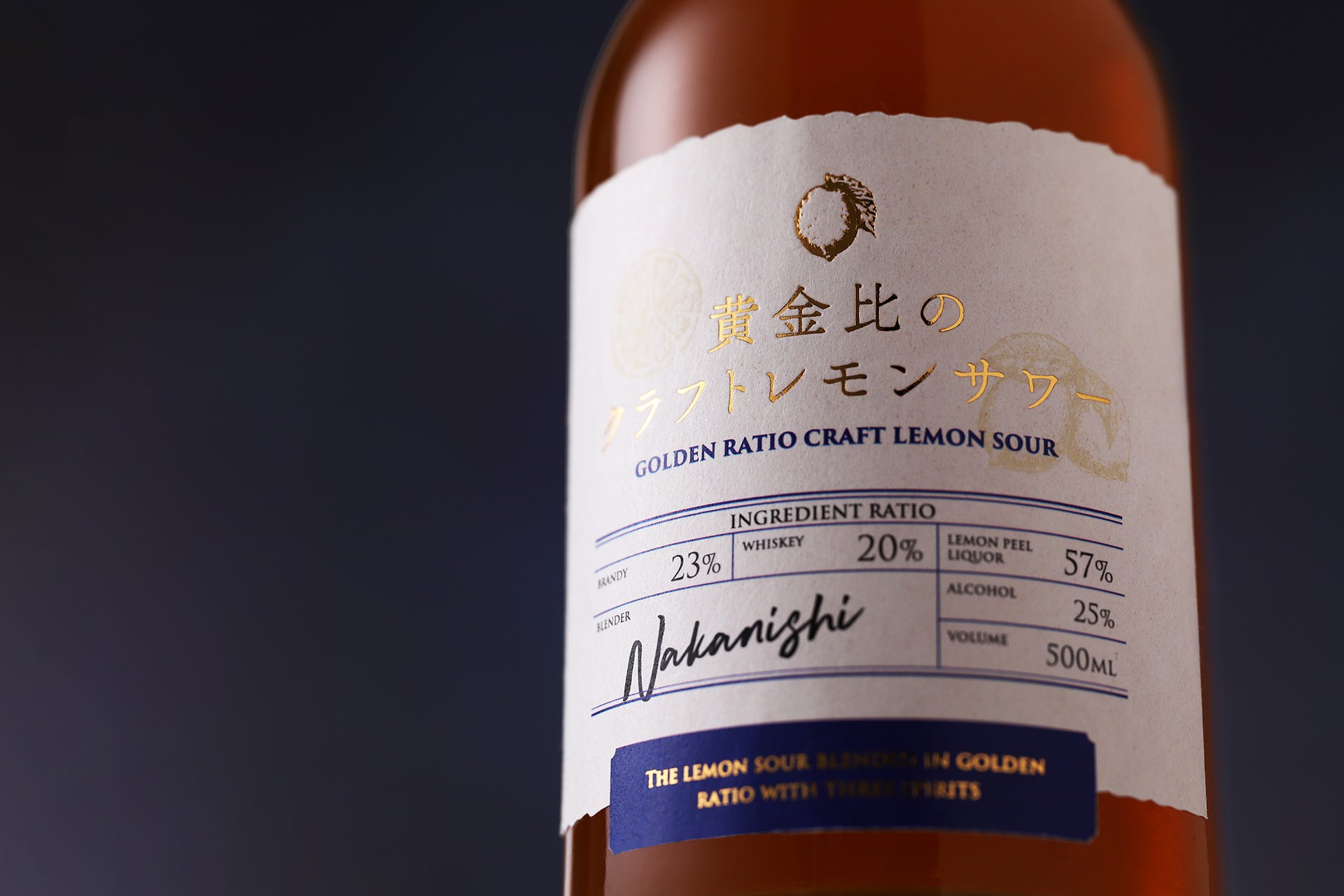 「黄金比のクラフトレモンサワー」は、レモンの果皮をじっくりと浸漬させたリキュールをベースに、国産ウイスキー、そしてブランデーを掛け合わせたワンランク上のレモンサワーです。味わいを調整する「ブレンダー」と呼ばれる職人が、3つの原酒を少しずつ調合しながら、その仕上がりをじっくりと吟味し、3種が調和したバランスのよい味わい目指し、「ブランデー23%:ウイスキー20%:レモンリキュール57%」の黄金比 に辿り着きました。