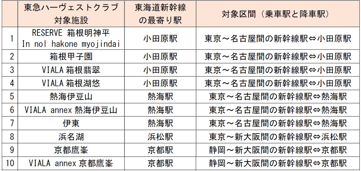 【東急ハーヴェストクラブ対象施設および対象区間】