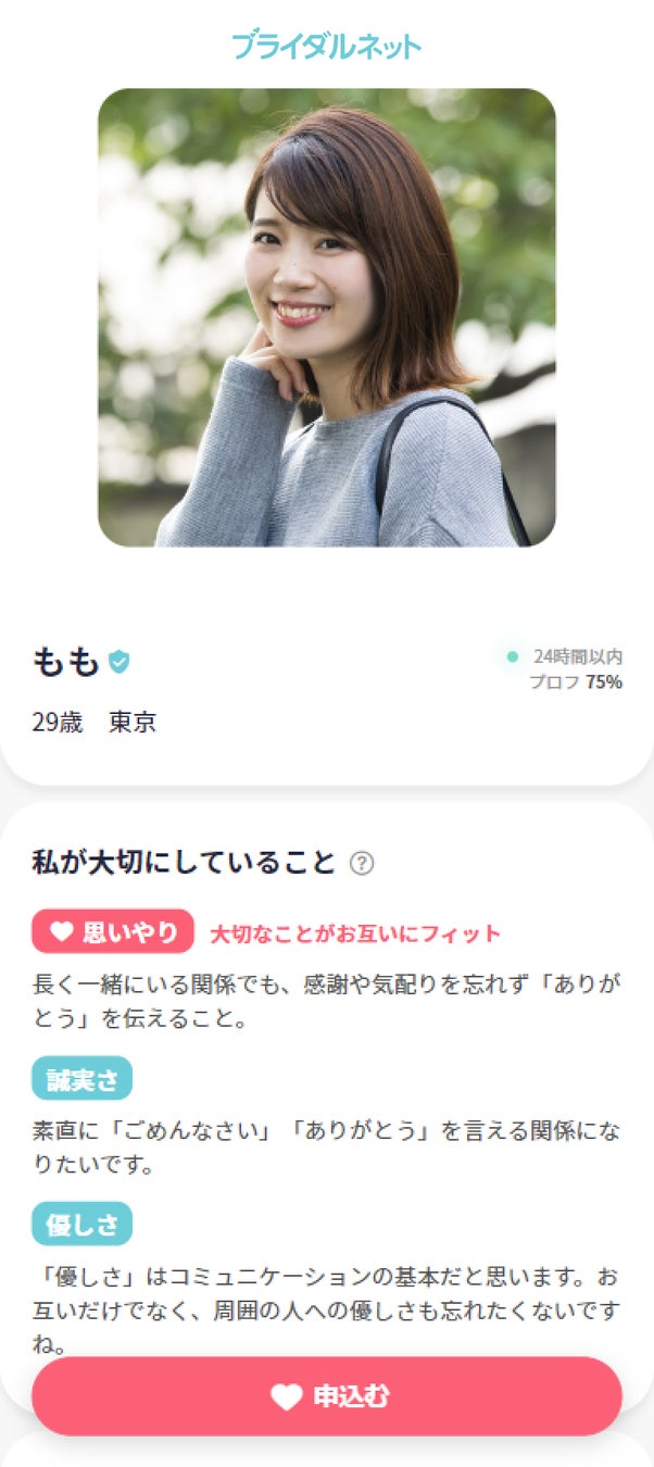 ブライダルネットでは、結婚を見据えた価値観の合うお相手との出会いを提供するため、プロフィールに新しいコンテンツとして、「私が大切にしていること」を追加しました。日々の生活の中でご自身が大切にしていることを「優しさ」「モラル・マナー」「正直さ」などの項目から選択し、コメントを添えてお相手に伝えることができます。その他にも新たに、共通の価値観やお相手が入っているコミュニティ*の割合がグラフで表示されるようになり、お相手の内面がより分かりやすくなりました。