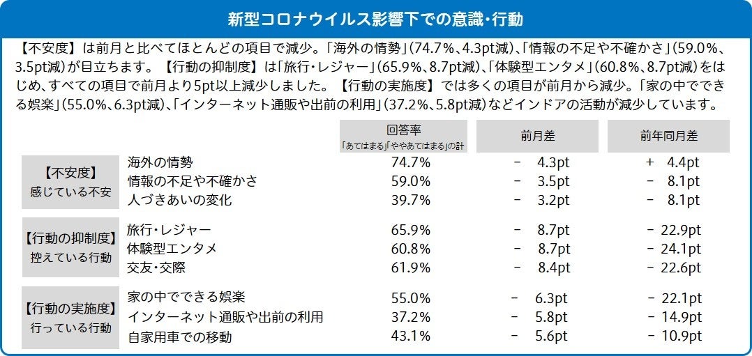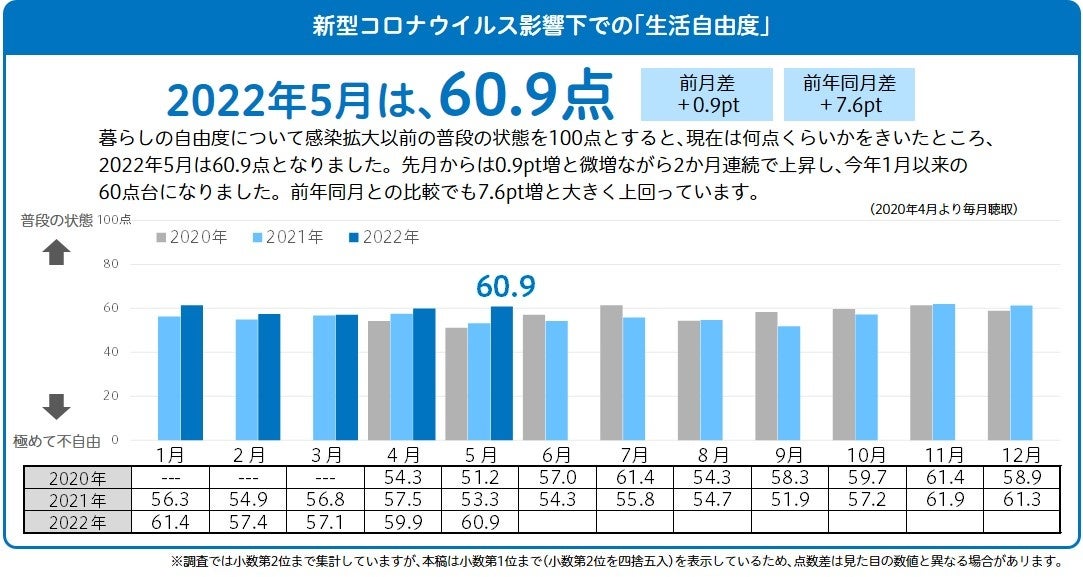 | 5月の「生活自由度」は2か月連続で上昇し、60.9点に。 「不安」も「行動の抑制」も引き続き緩む |