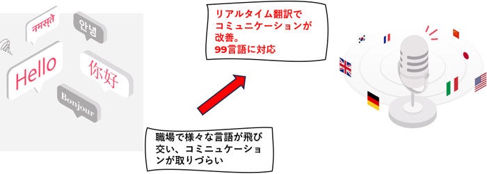 国際化が進み、あらゆる言語が飛び交う状況が予想されます。職場でのコミニュケーション改善、マニュアル等の連絡事項共有など、リアルタイム翻訳を使ったサービスを利用することが可能です。