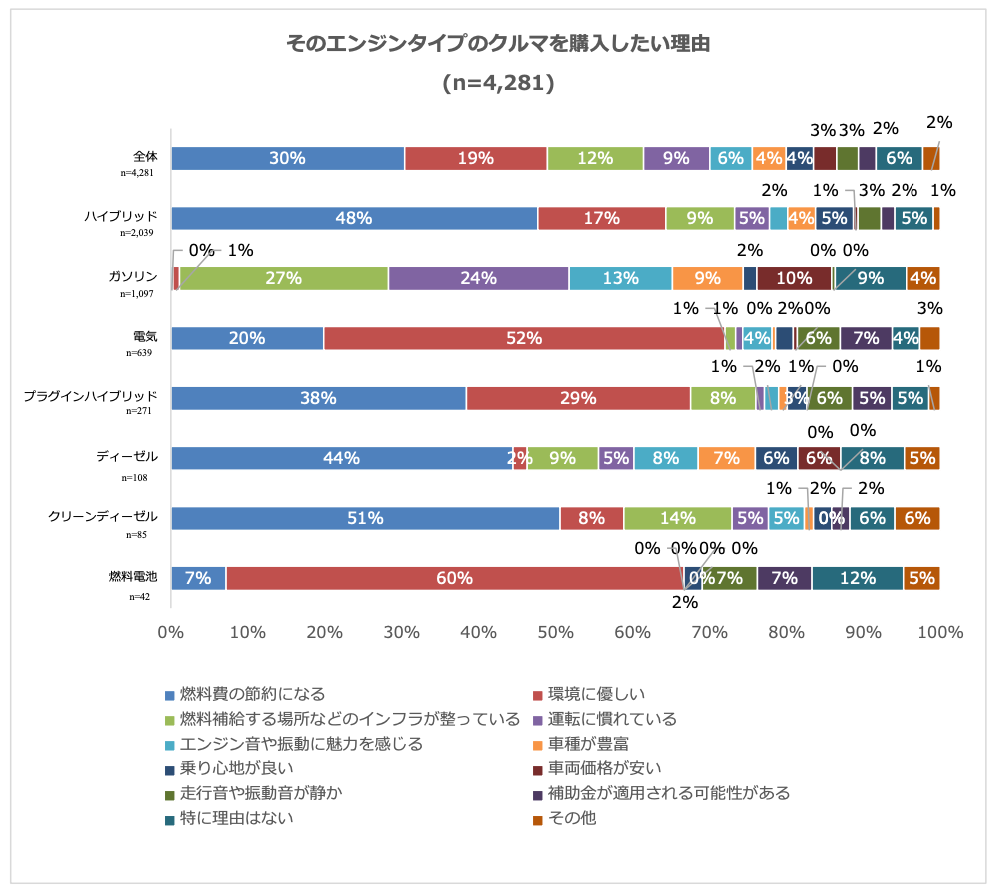 エンジンタイプ別で見ると、ガソリンは「燃料補給する場所などのインフラが整っている」と「運転に慣れている」を合わせると半数になりましたが、ガソリン以外は「燃料費の節約になる」と「環境に優しい」の合計比率が5割〜7割を占めており、理由に違いが見られました。