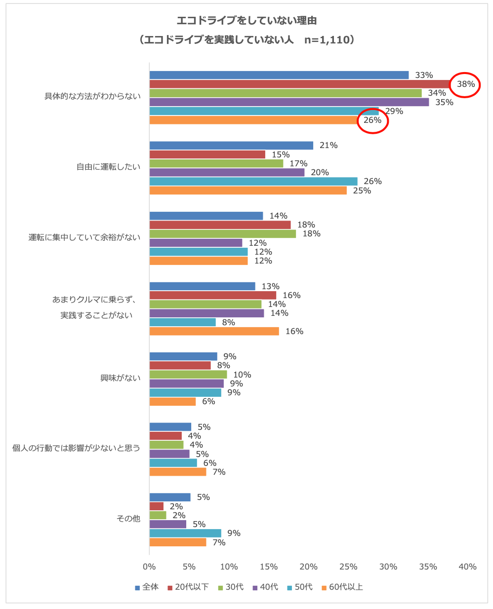 エコドライブをしていない理由は、1位「具体的な方法がわからない」33%、2位「自由に運転したい」21%、3位「運転に集中していて余裕がない」14%でした。