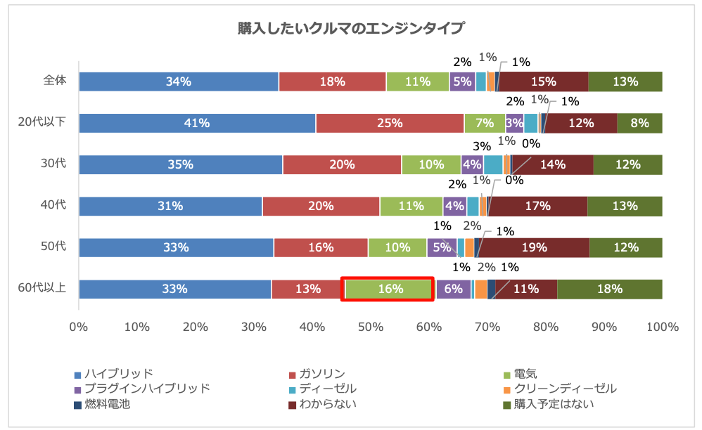 年代別で見ると、20代以下は「ハイブリッド」の比率が最も高く、4割を超えました。また、年代が上がるにつれて「ガソリン」の比率が低くなっており、60代以上では「電気」が「ガソリン」を上回りました。