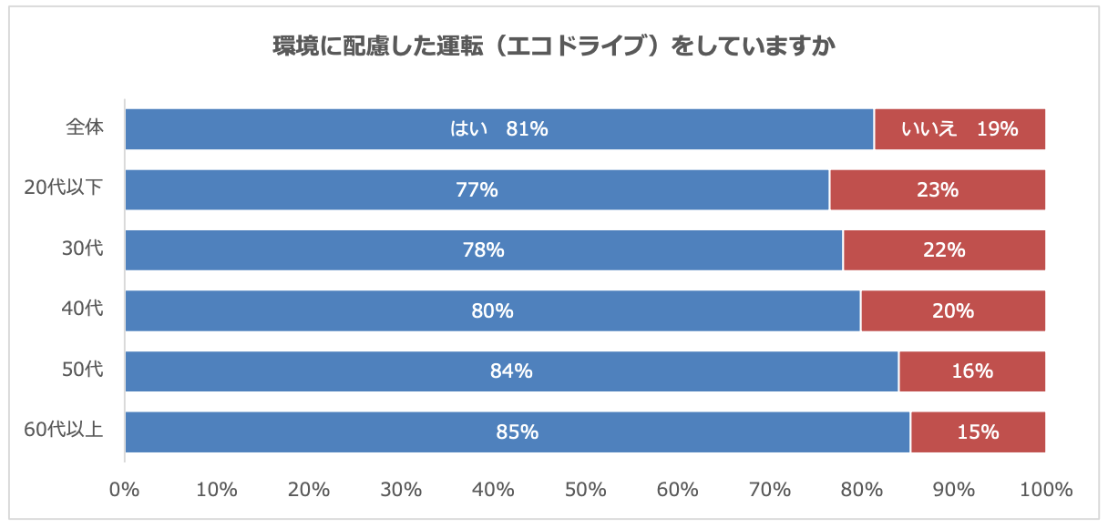環境に配慮した運転(エコドライブ)をしている人は81%でした。年代が上がるほどエコドライブをしている比率は高くなりました。