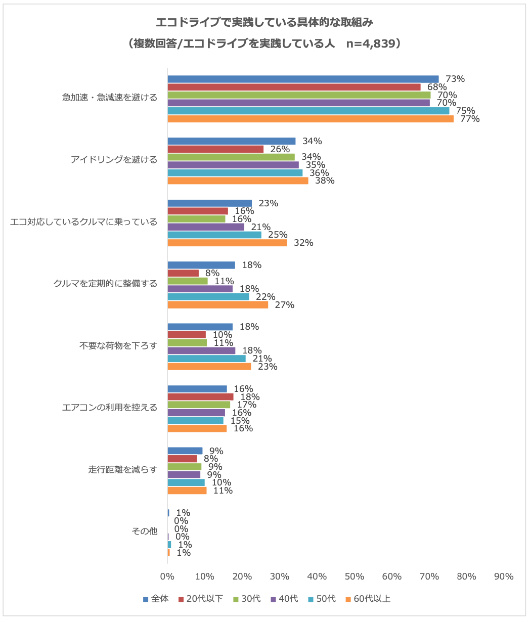 具体的に実践しているエコドライブは「急加速・急減速を避ける」73%が最も多く、次いで「アイドリングを避ける」34%、「エコ対応しているクルマに乗っている」23%と続きました。