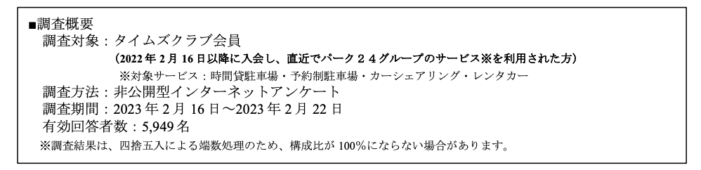 ※入会金・年会費無料の会員制ポイントプログラム。タイムズパーキングやタイムズカー、タイムズカーレンタルの利用等でポイントがたまる他、会員限定サービス等を提供。会員数約1,019万人(2023年3月末現在)。なお、本アンケートは、駐車場やカーシェア、レンタカー等のクルマに関わるサービスを利用した方々を対象としたものです。