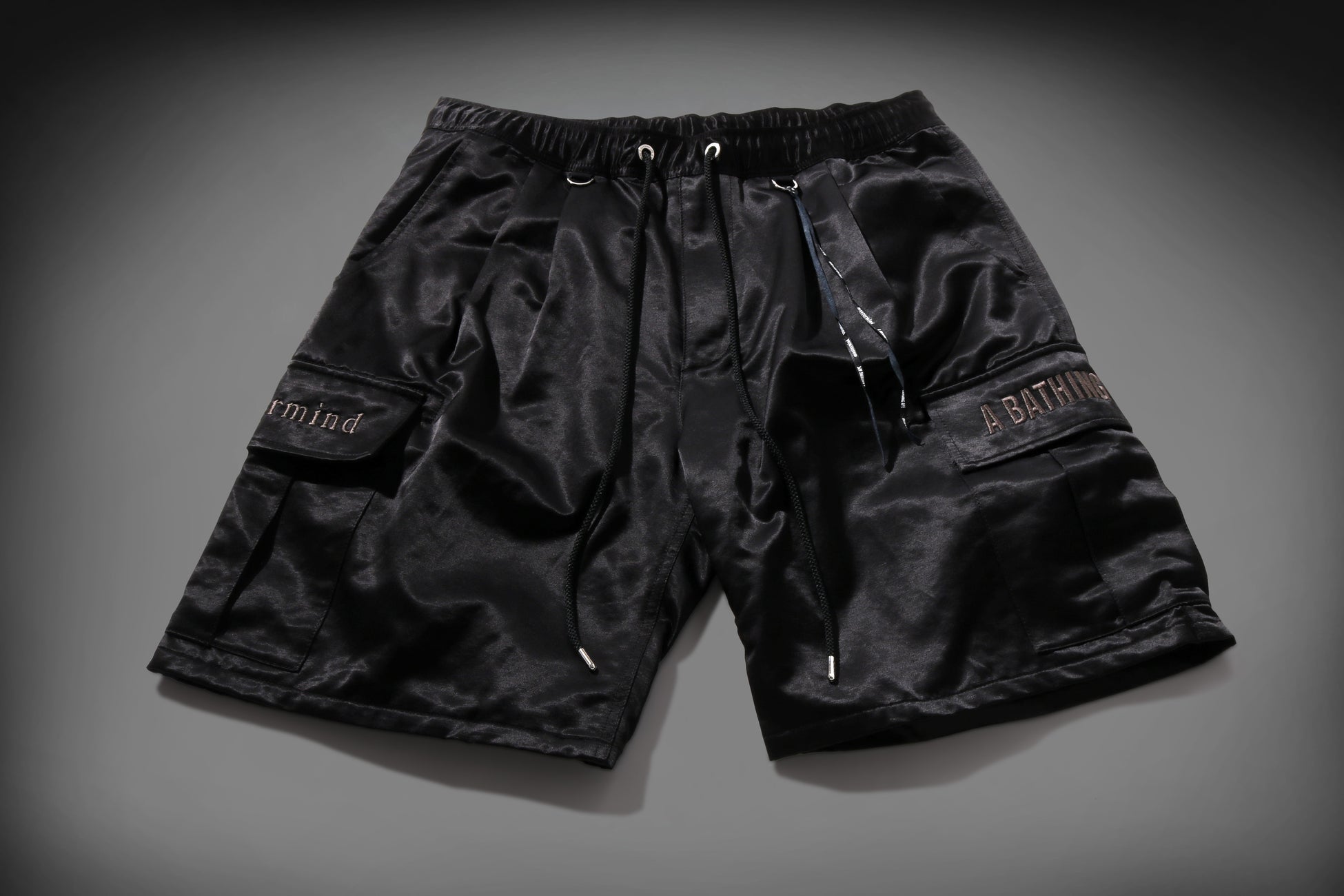 サテンショーツは、ブラックのボディに両ブランド名とロゴを同色で刺繍。サイドポケットには、mastermindのロゴジャガードテープをあしらっています。
