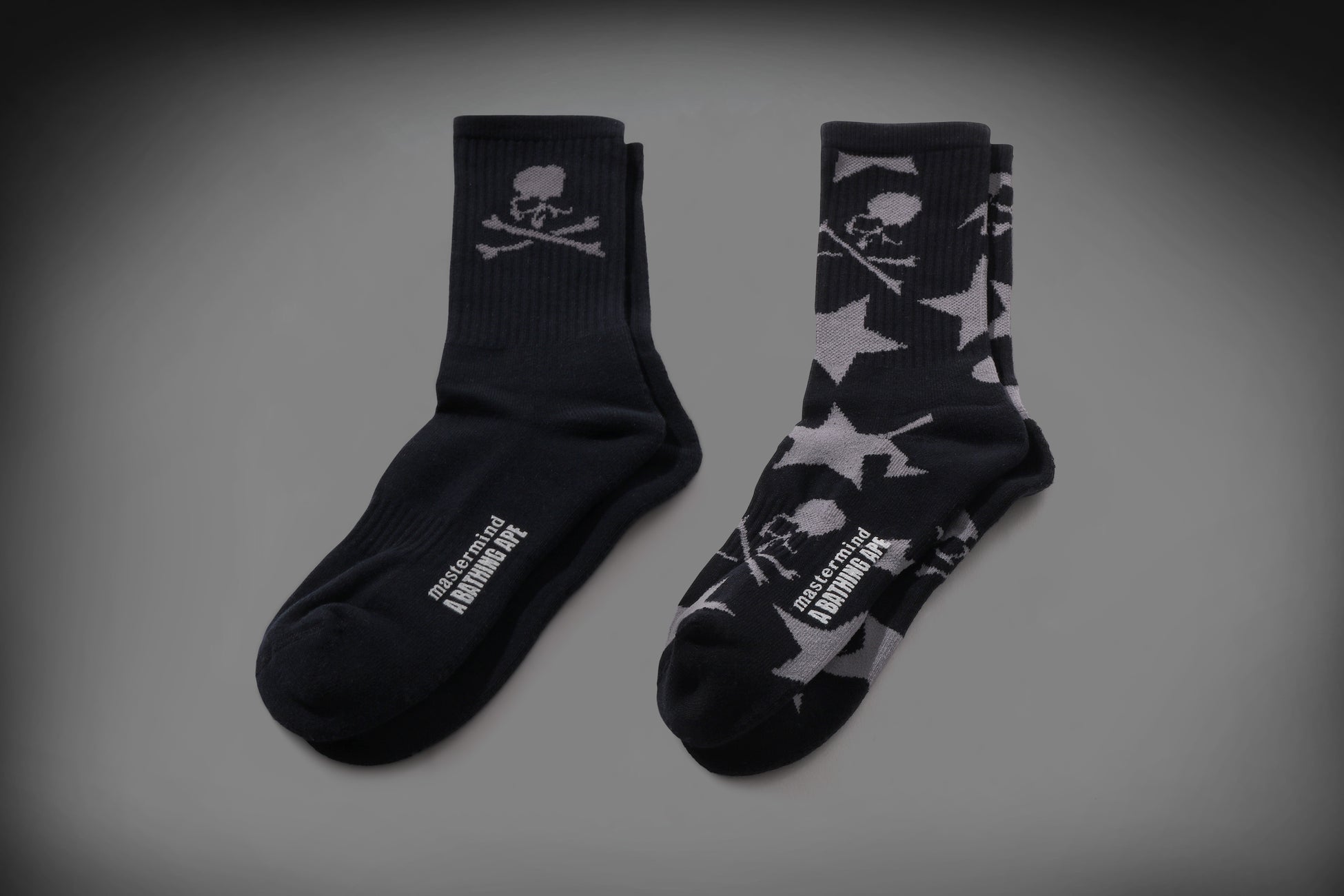 ソックスは、STAとクロスボーンスカルをアレンジした総柄タイプと、APE HEADとクロスボーンスカルを左右に配置したアシンメトリックなタイプの2型です。