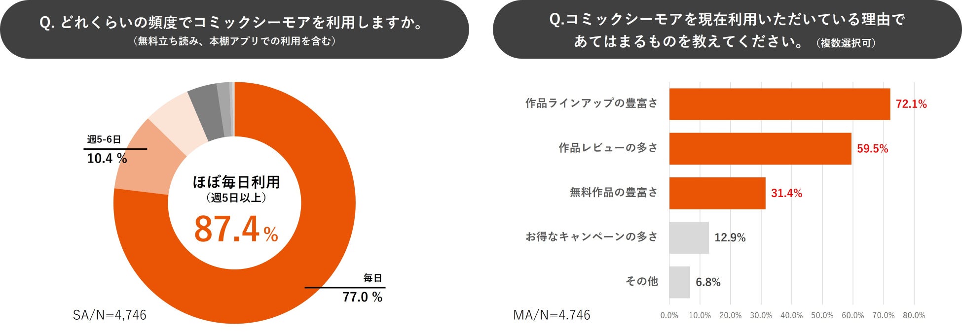 初めに、コミックシーモアの利用頻度を調査※1したところ、ユーザーの87.4%が「ほぼ毎日(5日以上)」利用していると回答。利用理由について伺うと、「ラインアップの豊富さ」が72.1%と最も多く、次点で「お得なキャンペーンの多さ」(59.5%)、「無料作品の豊富さ」(31.4%)という結果でした。