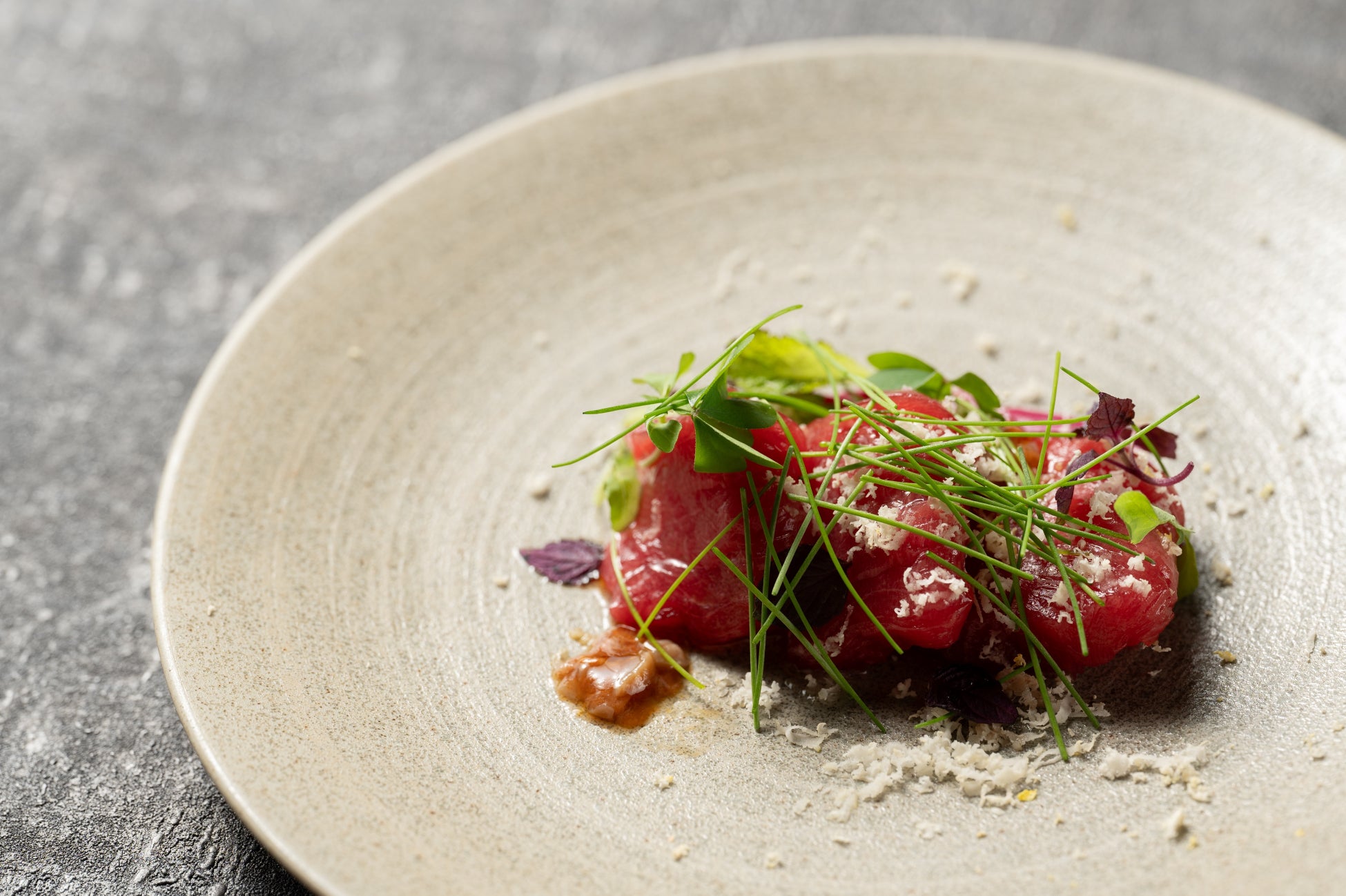 生本まぐろの赤身と中トロを炙り焼きにて調理し、旨味を凝縮しております。付け合わせににしわきファームさんの甘味がある無農薬野菜を添え、塩味のきいたまぐろ酒盗と合わせています。