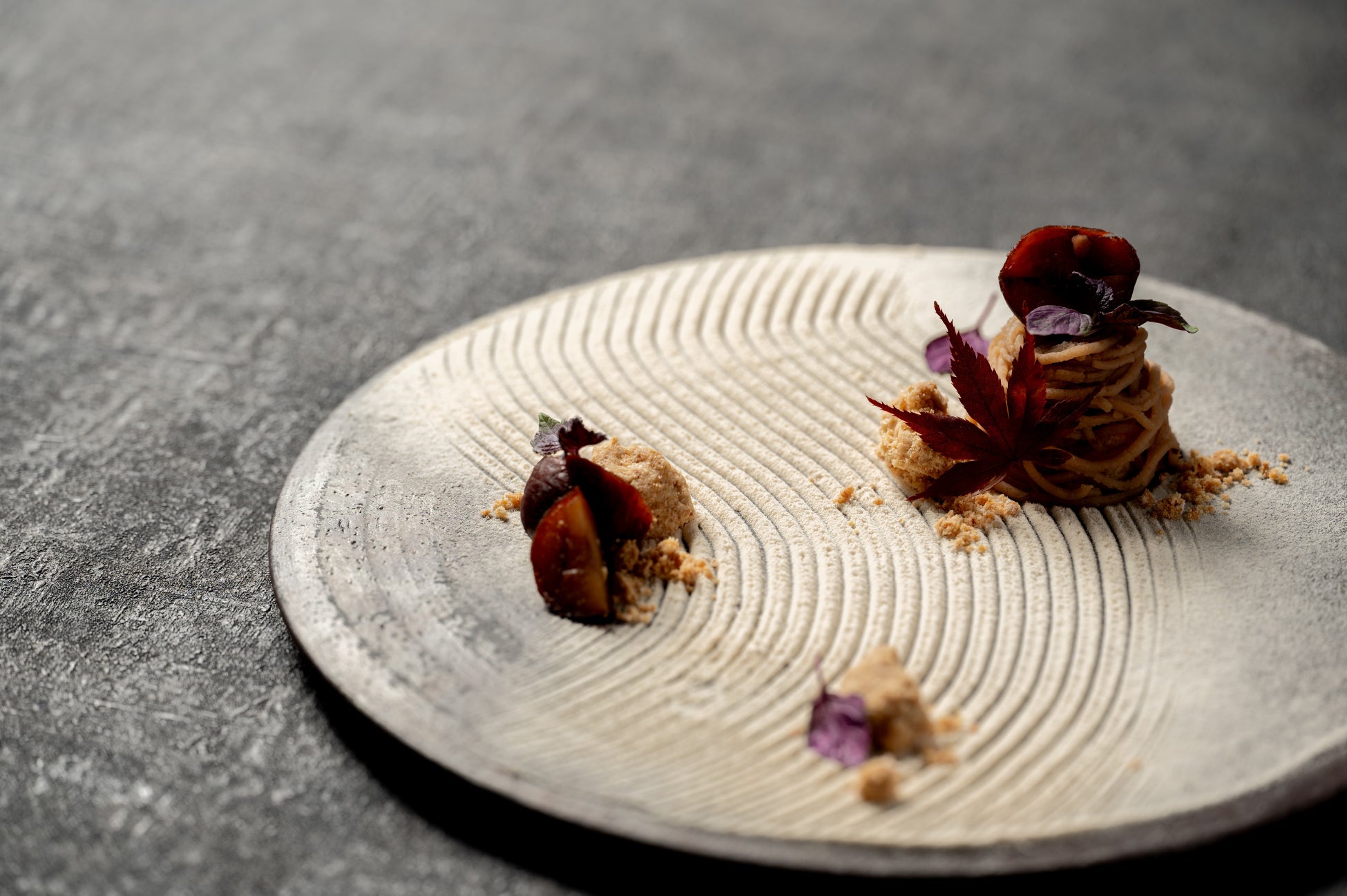 メイプルシロップを染み込ませたしっとりとしたジェノワーズ生地にあっさりとしたホイップクリームを合わせ、和栗と和三盆、おから使用した上品な甘味のモンブランクリームを絞りました。渋皮煮は和栗を丁寧に調理、素材を生かし甘すぎないよう仕上げました。お皿には和三盆とおからを乾燥させたパウダーを使用し、ゼンハウスを感じさせる枯山水を表現しています。