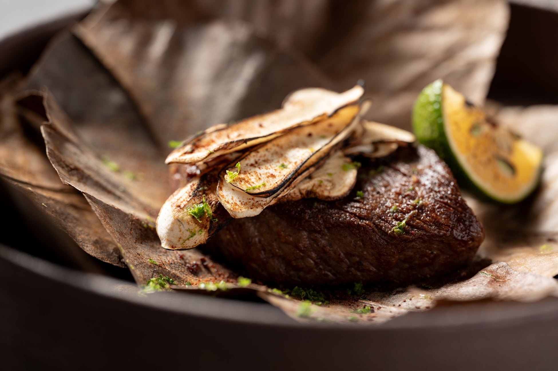 上品な赤身が多い赤牛は旨味と柔らかさヘルシーさを兼ね備えています。あか牛本来の味を味わって頂くために、最小限の下味で朴葉に包み込み旨味を閉じ込め、炙り焼きにしています。松茸とかぼすを合わせることでより香り深い味わいに仕上げました。
