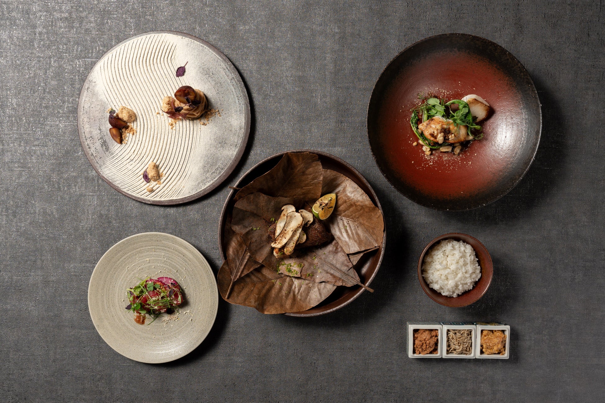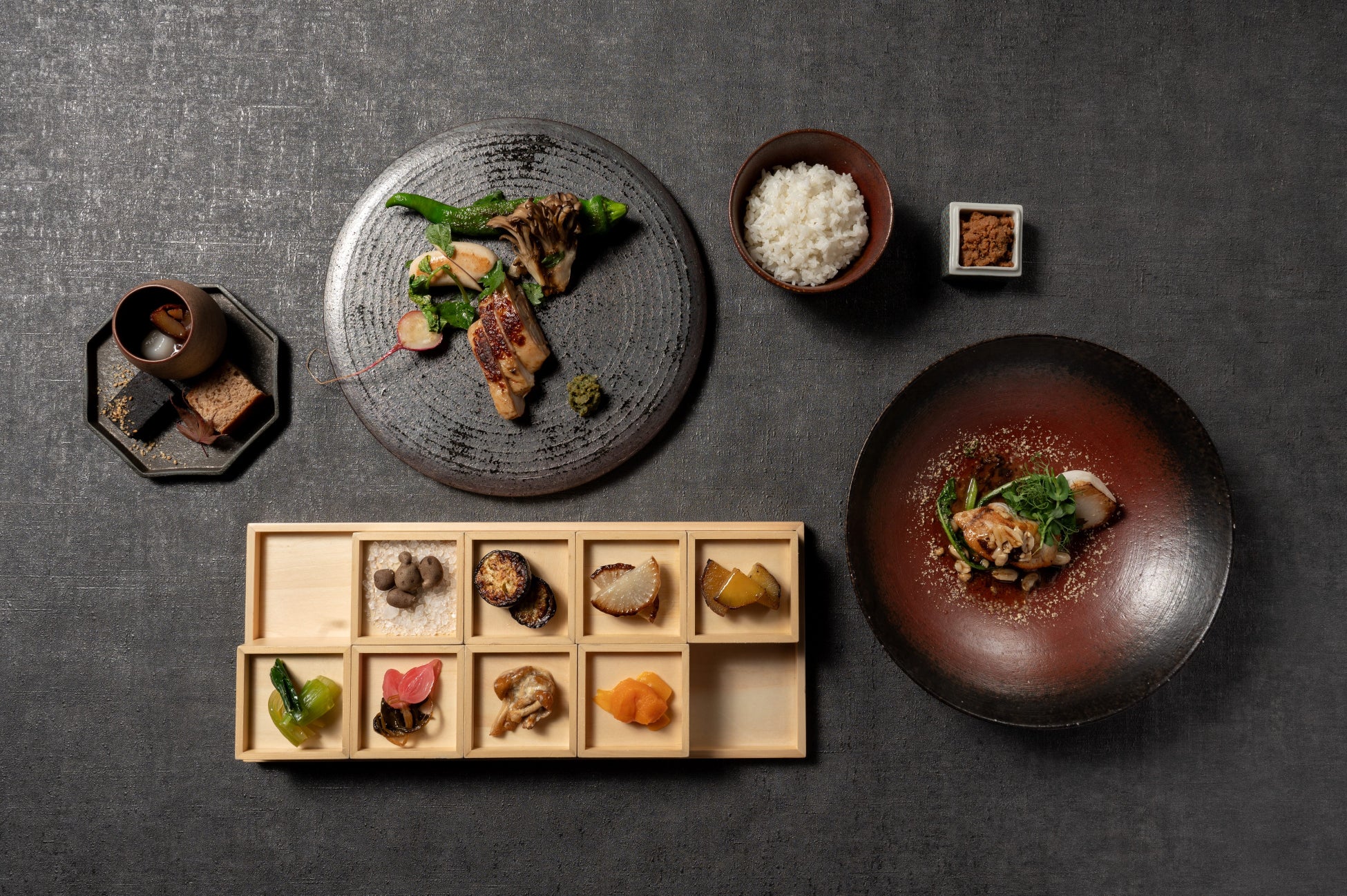提携農家から仕入れる国産の無農薬野菜はミネラルをたっぷりと含んだ上品な味わい。肉や魚は大きな塊で仕入れ、鮮度と旨味を保ちます。塩、醤油、そしてほんのり出汁が香るシンプルな現代里山料理は、前菜からデザートまで飽きのこない美味しさです。選りすぐりの食材を最低限の味付けで調理、一皿の中に「食感・塩味・酸味」をバランスよく感じる洗練された現代里山料理をお愉しみください。